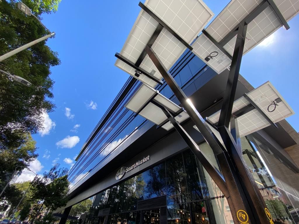 Paneles solares de la nueva tienda de Carulla en Bogotá. Foto: Carulla.En cuanto al tema de sostenibilidad en la franquicia, la marca dio a conocer que para el consumo consciente y responsable en el supermercado, se decidió eliminar la bolsa plástica, la cual fue reemplazada por papel biodegradable, y ya no tendrán disponibles bolsas para empacar frutas y verduras. Además, el punto de mercado cuenta con paneles solares.