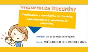 Gestión de Talento Humano, desde su proceso de Administración de la Compensación recuerda que el miércoles 8 de junio del 2022, es fecha asignada para realizar la Certificación y Aprobación de docentes, administrativos y monitores de Proyectos Especiales (Acuerdo 21) – Periodo a certificar del 10 de mayo hasta el 8 de junio del 2022.