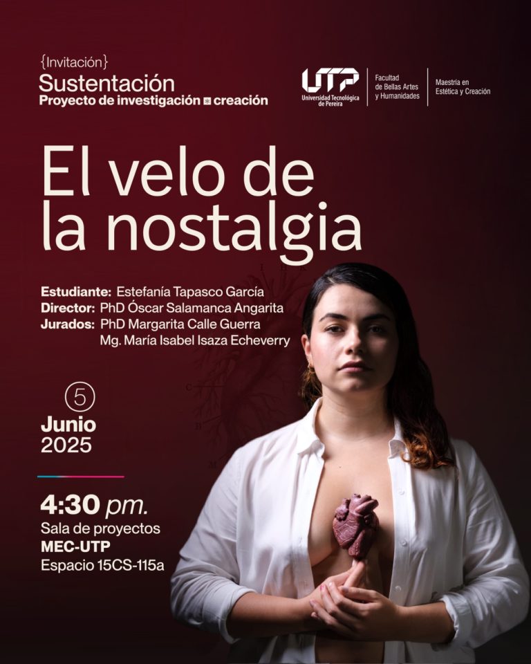 La Maestría en Estética y Creación de la Facultad de Bellas Artes y Humanidades invita a la sustentación del proyecto de investigación-creación titulado El velo de la nostalgia. Escenarios de comprensión estética del cuarto cuerpo y los lugares de atascamiento sentimental, de la estudiante Estefanía Tapasco García.