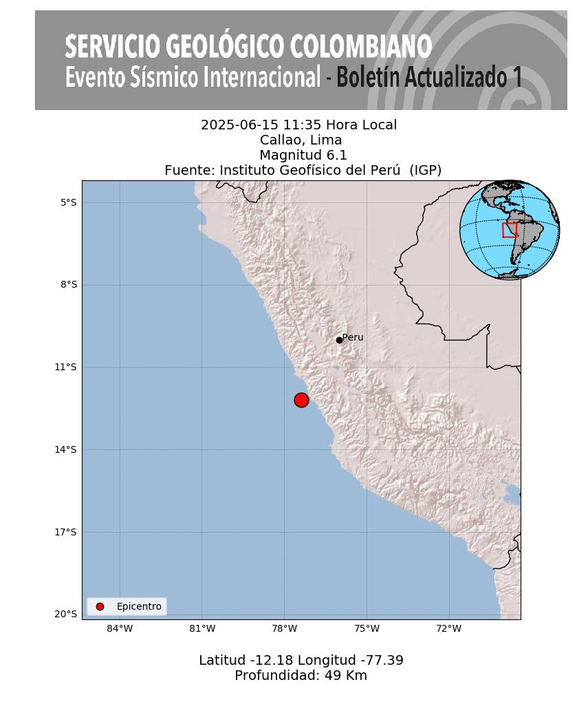Un sismo de magnitud 6,1 se registró este domingo en la ciudad portuaria Callao, en Perú, sin que se reportaran por el momento víctimas ni daños estructurales, aunque hubo deslizamientos de tierra en varios distritos en la cercana Lima.