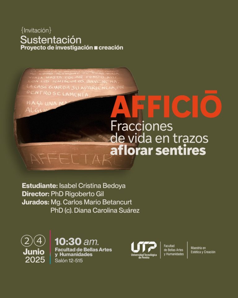 La Maestría en Estética y Creación, Facultad de Bellas Artes y Humanidades, invita a la Sustentación proyecto de investigación-creación titulado AFFICIŌ fracciones de vida en trazos. Aflorar sentires, de la estudiante Isabel Cristina Bedoya Zapata.