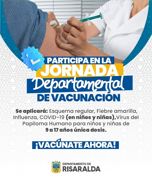 Pereira, 17 de julio 2025. La Gobernación de Risaralda, a través de la Secretaría de Salud, entidades municipales y hospitalarias, realizará la segunda jornada departamental de vacunación del año 2025, el próximo sábado 19 de julio.