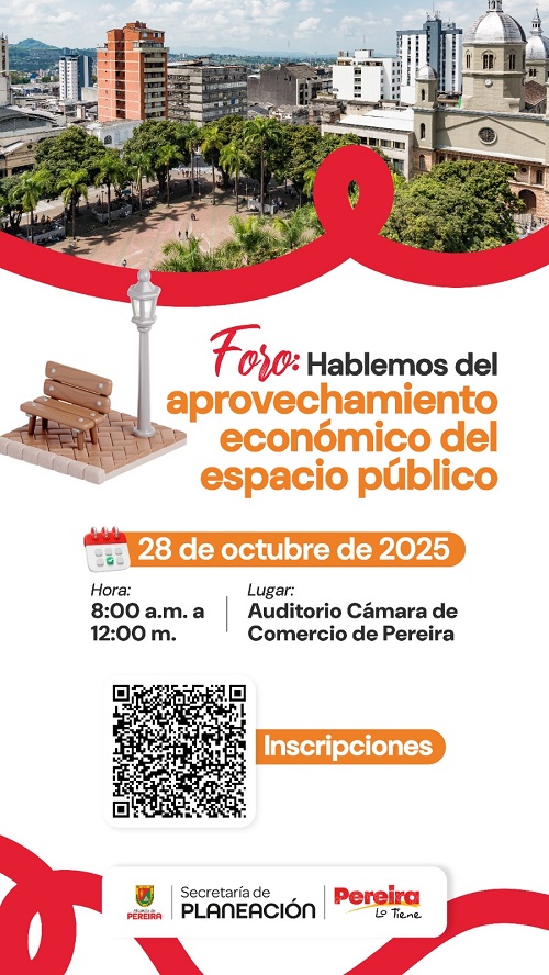 Con el propósito de fortalecer la gobernanza urbana y construir de manera colectiva los lineamientos que orienten el uso, gestión y sostenibilidad del espacio público en la ciudad, la Secretaría de Planeación Municipal de Pereira realizará el foro “Hablemos del Aprovechamiento Económico del Espacio Público”, el próximo martes 28 de octubre, de 8:00 a.m. a 12:00 m. en el Teatro Auditorio César Gaviria Trujillo, sede de la Cámara de Comercio de Pereira.