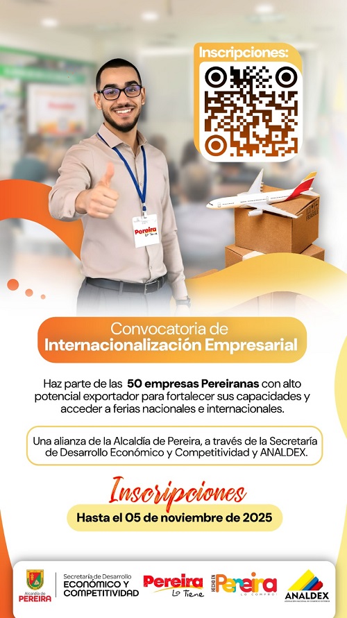 La Alcaldía de Pereira bajo el liderazgo del alcalde Mauricio Salazar Peláez, continúa impulsando la proyección internacional del tejido empresarial local. A través de la Secretaría de Desarrollo Económico y Competitividad, y en alianza con Analdex (Asociación Nacional de Comercio Exterior), abre una convocatoria dirigida a 50 empresas pereiranas con potencial exportador, interesadas en iniciar o fortalecer sus procesos de internacionalización.