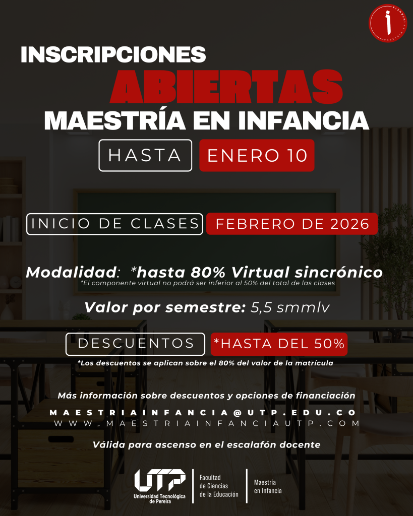 La Universidad Tecnológica de Pereira (UTP) informa que continúan abiertas las inscripciones para la Novena Cohorte de la Maestría en Infancia. Este programa, diseñado para profesionales que buscan un liderazgo activo en el desarrollo de la niñez, iniciará sus actividades académicas en el primer semestre de 2026.
