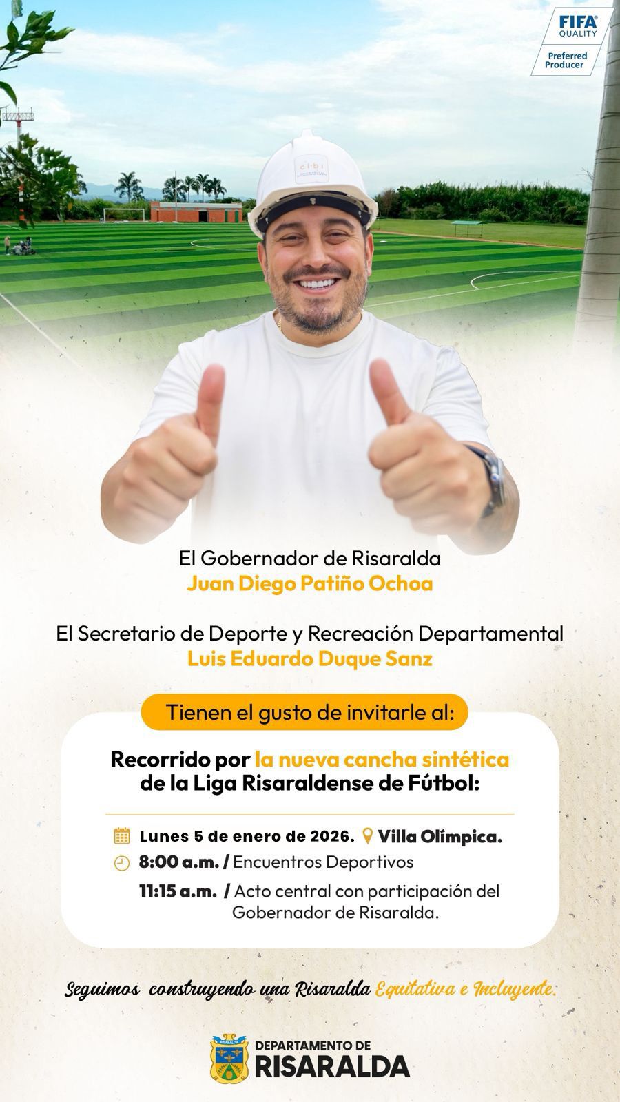 Pereira, Risaralda, 4 de enero de 2026. La Gobernación de Risaralda y su secretaría de deportes realizarán un recorrido este lunes 5 de enero por la nueva cancha sintética de la Liga Risaraldense de Fútbol en la que invirtieron, durante los últimos meses del año anterior, $2.664 millones provenientes de la tasa Pro Deporte y de infraestructura deportiva.