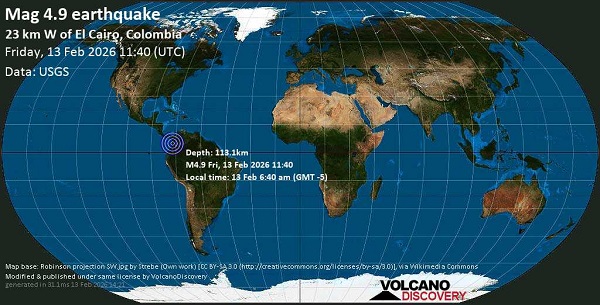 Un fuerte sismo de magnitud 4.9 golpeó a 54 km lejos de Tado, del Choco,  Colombia, en la madrugada de viernes, 13 feb 2026 a las 06:40 hora local (America/Bogota GMT -5). El temblor tuvo una profundidad moderado de 113 km y fue sentido ampliamente en el área.