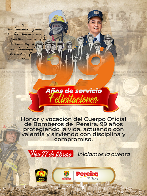 👩🏻🚒Hoy Pereira celebra 99 años de servicio, vocación y compromiso del Cuerpo Oficial de Bomberos, hombres y mujeres que han dedicado su vida a proteger a la ciudadanía con valentía y disciplina.