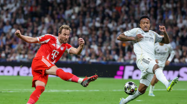 Bayern Munich's English forward #09 Harry Kane (L) shoots challenged by Real Madrid's Brazilian defender #03 Eder Militao during the UEFA Champions League quarter final first leg football match between Real Madrid CF and FC Bayern Munich at Santiago Bernabeu Stadium in Madrid on April 7, 2026. (Photo by Pierre-Philippe MARCOU / AFP)