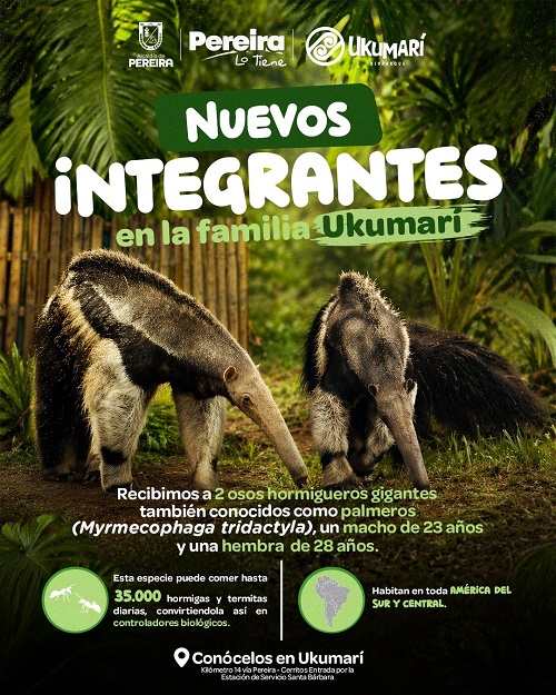 El Bioparque Ukumarí, el Santuario para la Flora, la Fauna y la Cultura demuestra su compromiso con el bienestar animal y la conservación de la fauna silvestre al dar la bienvenida a dos nuevos integrantes de la familia Myrmecophaga tridactyla, una pareja de osos palmeros u hormigueros gigantes.